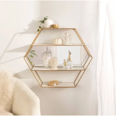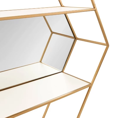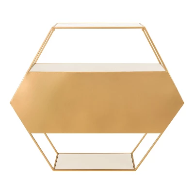 The sleek and sophisticated Lintz wall mirror is the perfect addition to your modern home. Inspired by contemporary minimalism and practical functionality, the Lintz mirror has a hexagon shape with a slim hexagon mirror between two inset shelves. The geometric frame is resilient yet elegant, composed of a sleek metal material. The glam gold finish on the Lintz frame is perfect for various decor scenes, creating a bold focal point in any space. The overall dimensions of the bold Lintz wall mirror are 28 inches wide by 6.5 inches deep by 24.25 inches tall, making it a great statement piece for any room. This depth makes each of the white inset shelves perfect for various purposes! Use the two shelves to showcase decorative accent pieces or store items like lotions, soaps, house keys, wallets, and more! The Lintz’s multifunctional design and sleek styling bring sophistication into any space. Hang this functional hexagon mirror in a matter of minutes with the metal eyelet hangers on the back of the frame.