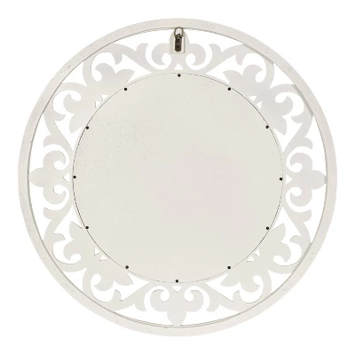 The Shovali is a decadent piece of wall decor with the rustic charm you crave. Embrace the highly-detailed elegance of a round frame carved with an ornate curvature to capture the imagination. The white finish enhances its vintage, shabby-chic aesthetic, breathing life into your modern farmhouse decor. The mirror has an overall diameter of 31.5 inches to draw the eye and improve your space with a dynamic focal point. Adding a mirror to your home expands your smaller spaces, opening the room up by reflecting light throughout the area. The Shovali mirror looks stunning on a fireplace mantle, above your entryway console, or in the bedroom over your dresser. Its round shape and 19.5-inch glass surface make it an excellent bathroom vanity mirror. Hang your new farmhouse decor easily, thanks to the metal D-ring hanger attached to the back.