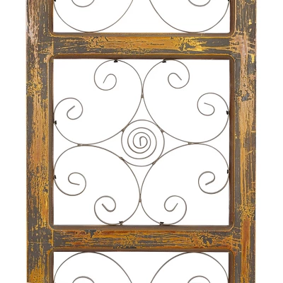 - Scrolled wall panel consists of a Chinese red pine wood frame with distressed brown finish