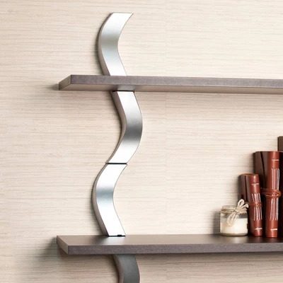 The floating Danya B. Brown 3 Tier Waves Shelf with its curvilinear accents is a piece of contemporary art. These wall mount shelves add accessible storage to a room while creating a contemporary design look with its decorative “S” brackets. You can set these shelves up to be presented together as a unit, or as three separate units. This type of easy-to-install shelving system is ideal for a bedroom, home office, laundry room, walk-in closet, pantry or virtually any room in the house. Made of durable MDF and plastic in contemporary silver finish. Brackets hold 3 shelves in an elegant walnut finish melamine.