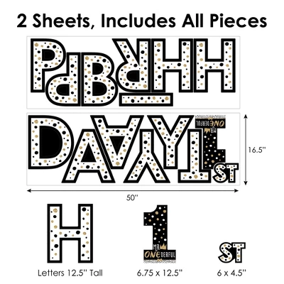 1st Birthday Little Mr. Onederful Large Banner Wall Decals include 2 sheets of vinyl sticker letters that spell “Happy Birthday” and 2 1 Number 1 and 1 “st” shapes that will look great as part of your Boy First Birthday Party decorations. Wall Decal sheet measures 50 inches wide by 16.5 inches tall. Pieces range in size from 12.5 inches to 6.75 x 9.25 inches. Effortless Decor: Hang the 1st Birthday Little Mr. Onederful letters next to each other to form a party banner. They can be hung vertically or horizontally and will add some extra charm to your party space within minutes! Use the wall decal banner at your entryway, over the food table, or on a photo booth backdrop. Easy to Use: First Birthday vinyl decals are easy-to-peel and repositionable. Wall art stickers will adhere to various surfaces including painted walls, plastic, wood, glass, and metal. To use, make sure your surface is clean and dry. Slowly peel the sticker from the paper to avoid tearing and smooth over with your hand. They are also easy to remove, leaving no residue. High-Quality Supply: Black and Gold wall stickers come with a quality matte finish and vibrant colors. They are printed on water-resistant professional quality material and will arrive on one full sheet rolled. Made In The USA: 1st Birthday Little Mr. Onederful Wall Decals are designed and manufactured at our Wisconsin facility using materials that are Made in the USA. 1st Birthday Little Mr. Onederful Vinyl Stickers uses a No-Mess Glitter Print: Our vinyl stickers are designed with a printed image of glitter, eliminating glitter flake while maximizing bling effect!