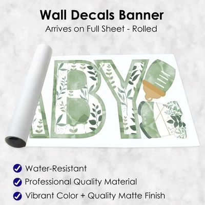 Boho Botanical Baby Standard Banner Wall Decals include 1 sheet of vinyl sticker letters that spell “Baby” and 1 Baby Bottle and 1 Baby Body Suit shapes that will look great as part of your Baby Shower Party decorations. Wall Decal sheet measures 50 inches wide by 16.5 inches tall. Pieces range in size from 12.75 x 15.5 inches to 5.25 x 9.75 inches. Effortless Decor: Hang the Boho Botanical Baby letters next to each other to form a party banner. They can be hung vertically or horizontally and will add some extra charm to your party space within minutes! Use the wall decal banner at your entryway, over the food table, or on a photo booth backdrop. Easy to Use: Greenery vinyl decals are easy-to-peel and repositionable. Wall art stickers will adhere to various surfaces including painted walls, plastic, wood, glass, and metal. To use, make sure your surface is clean and dry. Slowly peel the sticker from the paper to avoid tearing and smooth over with your hand. They are also easy to remove, leaving no residue. High-Quality Supply: Boho wall stickers come with a quality matte finish and vibrant colors. They are printed on water-resistant professional quality material and will arrive on one full sheet rolled. Made In The USA: Boho Botanical Baby Wall Decals are designed and manufactured at our Wisconsin facility using materials that are Made in the USA.
