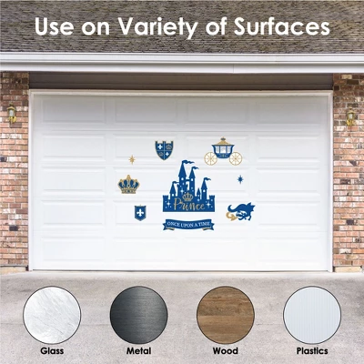 Big Dot of Happiness Royal Prince Charming Wall Decals includes 1 sheet of 20 assorted vinyl wall art stickers that you can arrange to add a special touch to your home decor. Wall Decal sheet measures 50” wide by 16.5” tall. Pieces range in size from 15 x 9.5” to 2.25 x 3.25”. Effortless Decor: The Castle and Carriage wall stickers are an easy solution for bringing in some added charm to your space within minutes! You can use the wall decals for nursery and kids’ rooms, impressive photo backdrops, or as easy decor at your Baby Shower or Birthday Party. Easy to Use: Royal Prince Charming vinyl decals are easy-to-peel and repositionable. Wall art stickers will adhere to various surfaces including painted walls, plastic, wood, glass, and metal. To use, make sure your surface is clean and dry. Slowly peel the sticker from the paper to avoid tearing and smooth over with your hand. They are also easy to remove, leaving no residue. High-Quality Supply: Royal Prince Charming wall stickers come with a quality matte finish and vibrant colors. They are printed on water-resistant professional quality material and will arrive on one full sheet rolled. Made In The USA: Castle and carriage Wall Decals are designed and manufactured at our Wisconsin facility using materials that are Made in the USA. Royal Prince Charming Vinyl Stickers uses a No-Mess Glitter Print: Our vinyl stickers are designed with a printed image of glitter, eliminating glitter flake while maximizing bling effect!