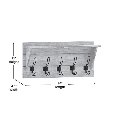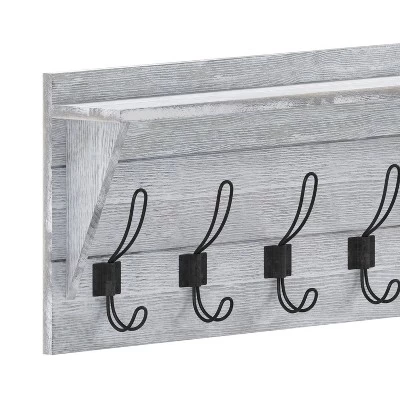 Rustic style meets modern functionality in this country style entryway shelf. Thoughtfully crafted from solid wood for reliable strength and finished in a beautiful whitewashed, this wall-mounted coat rack shelf is perfect for any room in any home. Five rustic hooks are designed with added space between them to give you maximum hanging space for coats, scarves, keyrings, leashes and more. The 24″ shelf is perfect for candles, houseplants, photos and more adding a creative element to this beautiful shelf. The inlaid hanging hardware and included screws and wall anchors make setting up your new shelf hassle free for immediate enjoyment. Add to your kitchen for utensils and spices, mud room for raincoats and umbrellas or anywhere else in your home for organization and style.