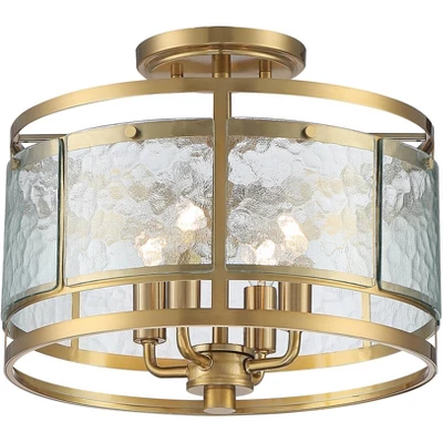 Embrace the old-school look and feel of this industrial four-light semi-flushmount ceiling light. From Franklin Iron Works™, the light features a wide band of beautiful water glass that offers texture and dimensionality to any decor. Crafted in metal, the light shows off a rich gold finish that perfectly accentuates traditional, industrial, or contemporary decor.