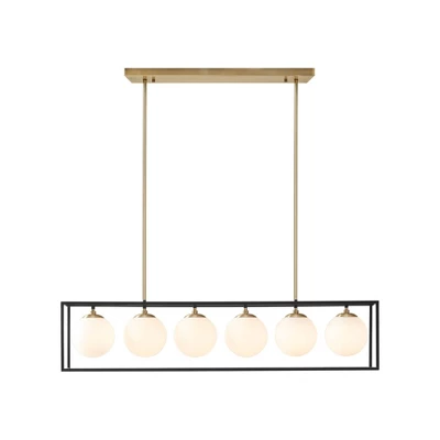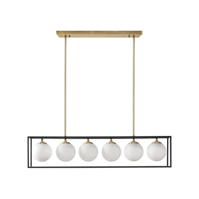 Inspired by striking industrial styles, the INK+IVY Helena 6-Light Frosted Glass Globe Linear Chandelier offers a bold vintage update to your dining decor. This rectangular chandelier features an open cage design with 6 glass globe shade that brilliantly illuminate your space. An antique brass rectangular ceiling mount with 2-side downrods complements the transitional look that easily reinvigorates your kitchen or dining room. Uses 6, CFL 13W or LED 9W Type B light bulbs (not included).