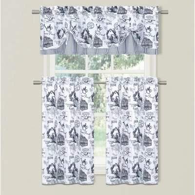 Bring in that vintage Toile look to any room with these stunning shabby chic designed kitchen curtain tier and valance set by Kate Aurora Living. Features a Vintage rooster design these window treatments will add that stunning appeal to your home. Rod pocket headers. Machine washable and dry able. Ready to use right out of the package.
