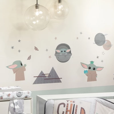 These out of this world wall decals are a great way to add a feature wall in your child’s room. There are four sheets that are approximately 12” X 18” each. There are 23 pre-cut pieces. Featured is The Child in three different poses. One pose has The Child holding a blue cookie, second pose is a side view with The Child reaching for a butterfly. The third pose has Baby Yoda inside his cradle pod. There are 14 stars, a small sitting frog, two butterflies, mountains and two planets. Designed for smooth walls, these are easy to apply and will not harm your walls upon removal.