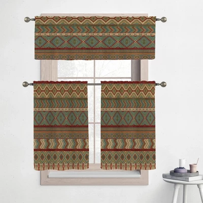 Upgrade your lake house or cabin decor with the “Country Mood Sage” kitchen tier set. It features intricate geometric patterns of warm Earth tones. The brown, red, and tan throughout this design gives it a distinctively Western feel. This handsome set is ready to frame your kitchen windows!