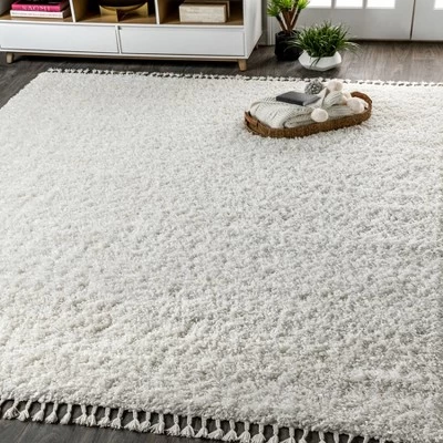 - Soft white shag with twisted fringe adds texture