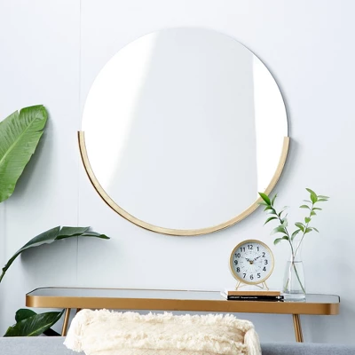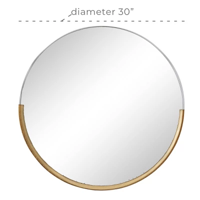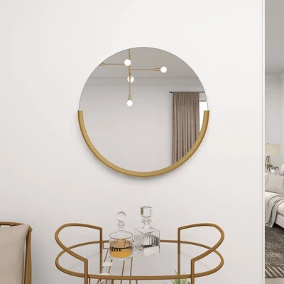 Use this modern wall mirror to create a focal point above an end table or shelf. This item ships in 1 carton. Features a half-circle frame in a metallic gold finish. Can be hung vertically using the D-rings on the back; nails and screws not included. Suitable for indoor use only. This item ships fully assembled in one piece. Made in India. This is a single gold colored entryway mirror. Modern style.