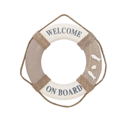 - This nautical wall decor showcases a round buoy with jute rope accents and a "WELCOME ON BOARD" painted text