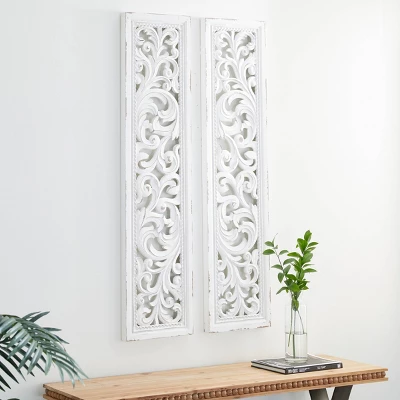 - These rectangular wall decorations are carved with intricate botanical details, white-painted, and given outline distressing for a traditional feel