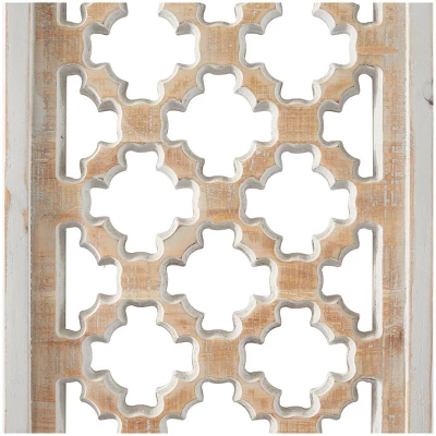 - Tall arched wall decor features a trellis inspired carved out pattern with an open back inside a white border frame for a structured look with a rustic appeal